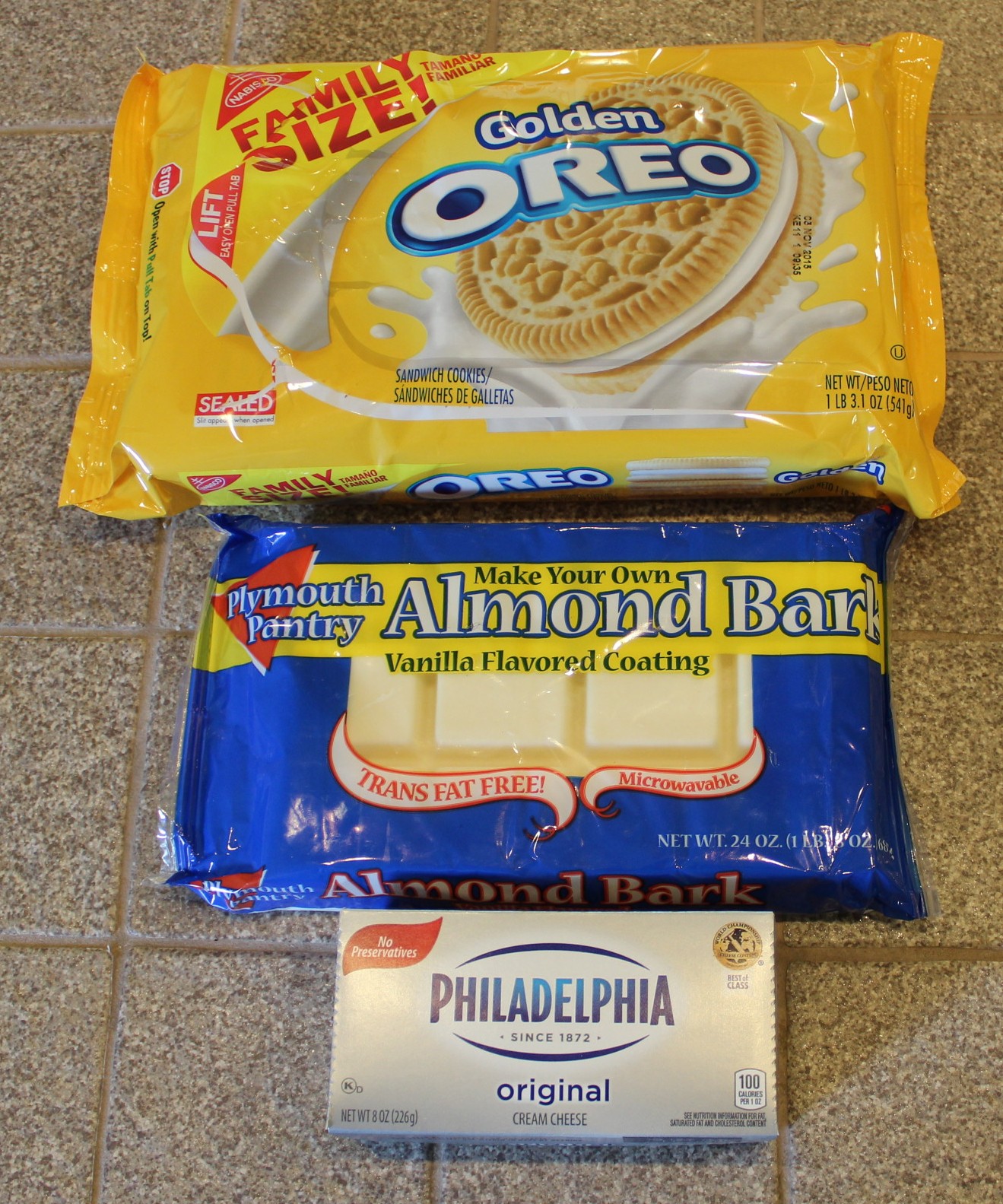 One of the best things about these is you can do a million different things with them. You can use any kind of Oreo. My personal favorite is a tie between the Mint and Golden Oreos. Honestly you don’t even have to use Oreos, I’ve made them with Nutter Butter cookies, and they were outstanding. You can use any kind of candy coating. Also, you can decorate them in an endless variety of ways. IMG_1652The only ingredients you absolutely need are 1 package of Oreos (you pick the flavor), 1 package of almond bark (candy melts also work great), and 1 block of cream cheese. This is really all you need if you’re just going to make them fast and simple. With how great they taste, people aren’t going to care if they’re fancy, so if you’re in a hurry just keep it simple! Note: In the picture it is a family size package of Oreos, you actually only need the regular size. I only get the family size to bribe my boyfriend not to eat the ones I need. (9 for you, 36 for me! All’s fair in love and baking)