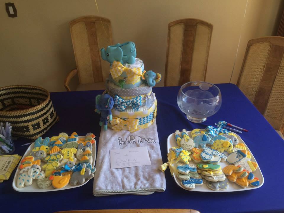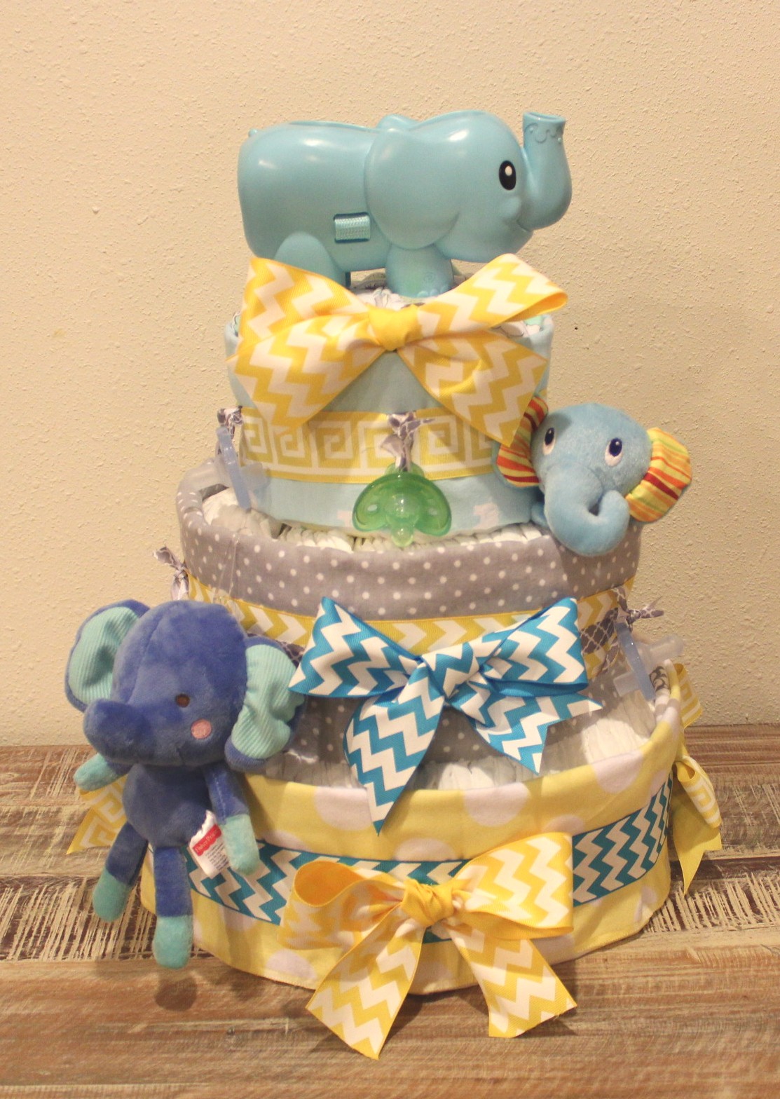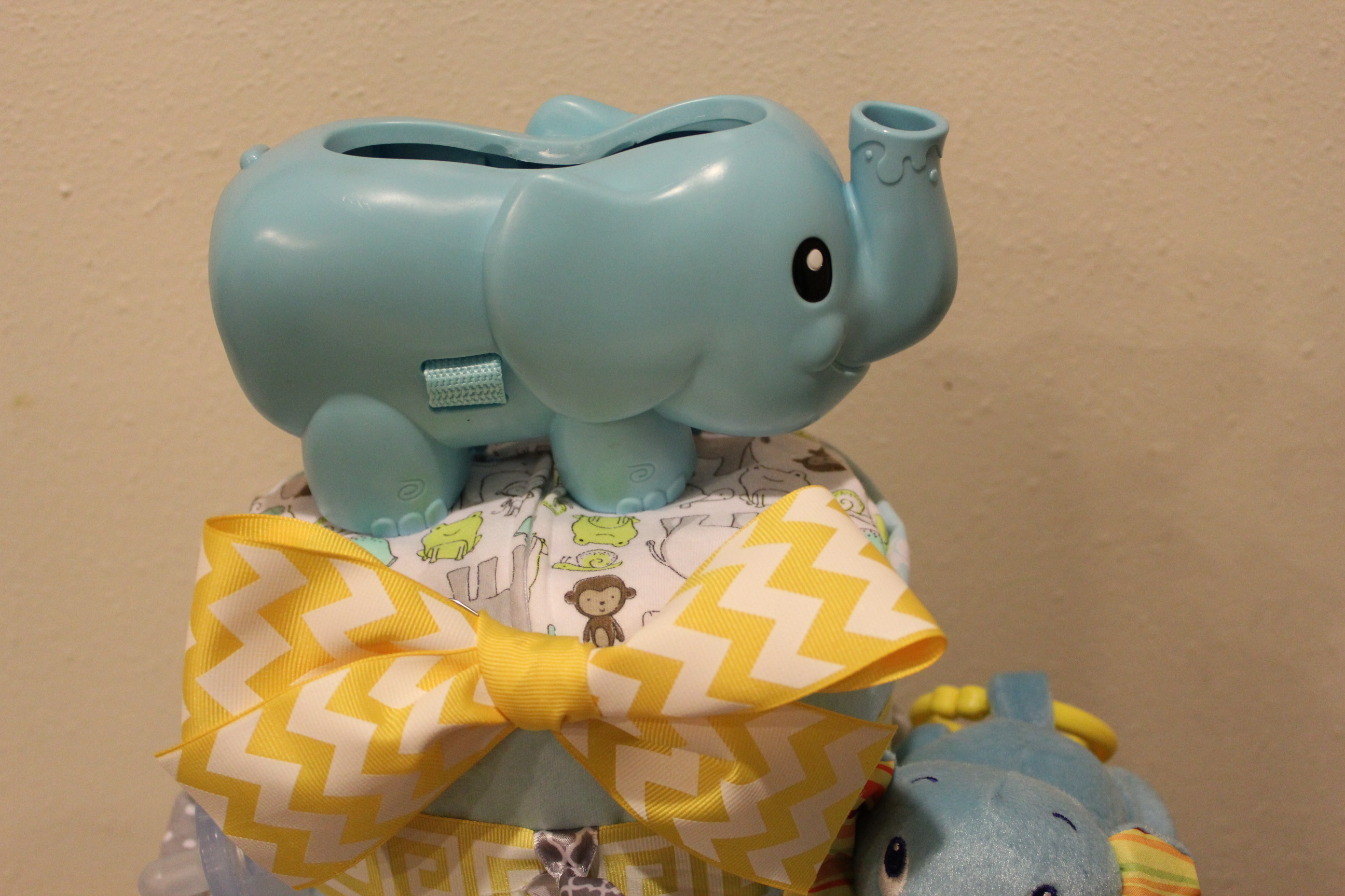 I usually look around for a few toys or products that match the theme or colors. This cake was elephant themed so I found some little elephant toys and a cute onesie. If you don’t have a theme, just get some bath time items like baby shampoo and lotion. I always get a few pacifiers because they’re easy to hang off the cake to fill blank spots.