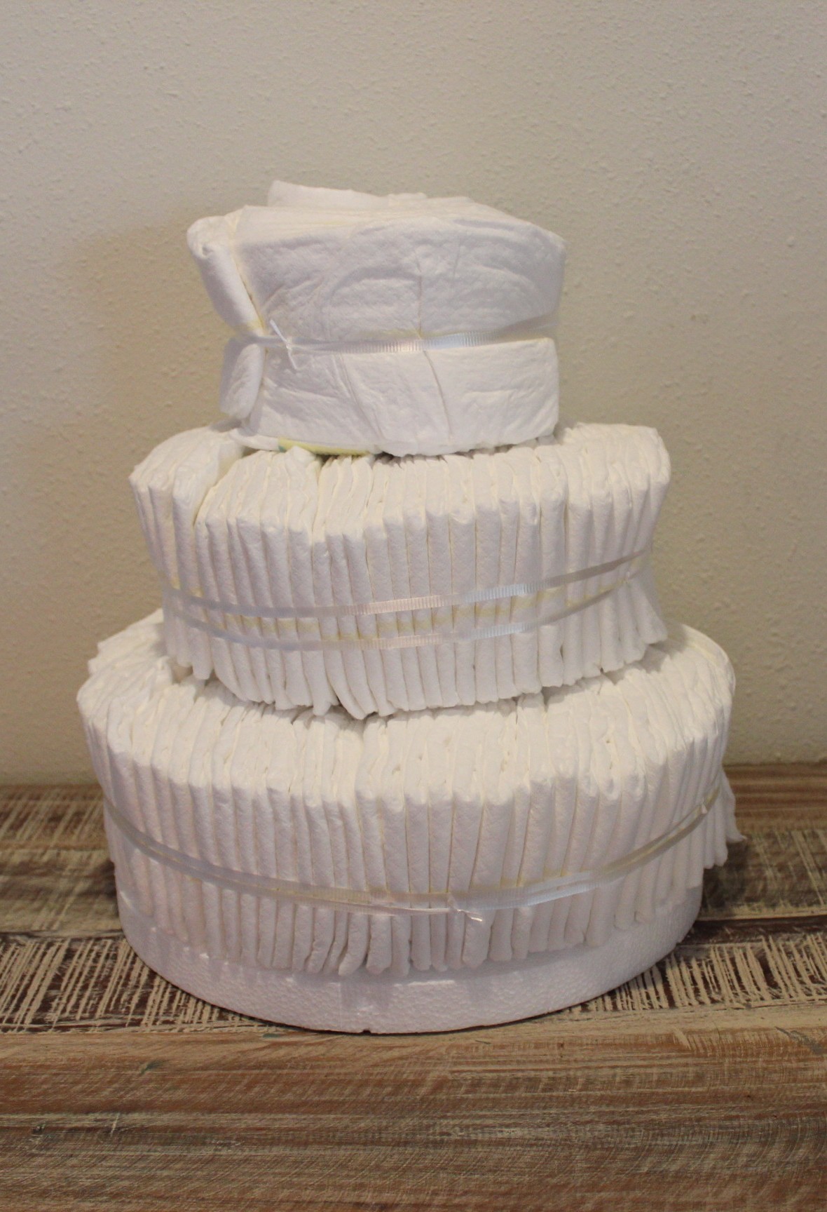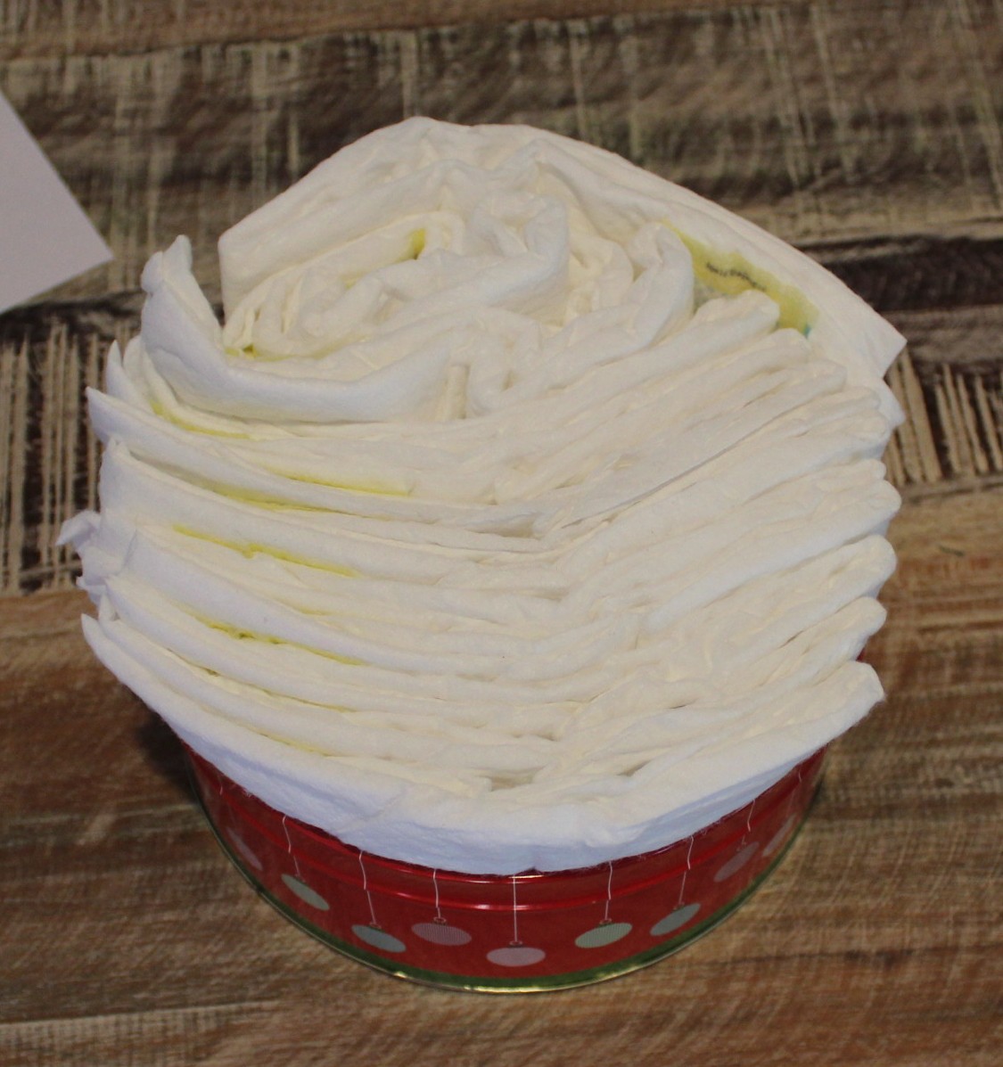 For diapers, I get a case of size 2 pampers swaddlers. This size will make ideal layers for your cake. They won’t fit baby right away, but they’ll grow into them and I’m told babies outgrow the newborn and size 1 diapers very quickly.