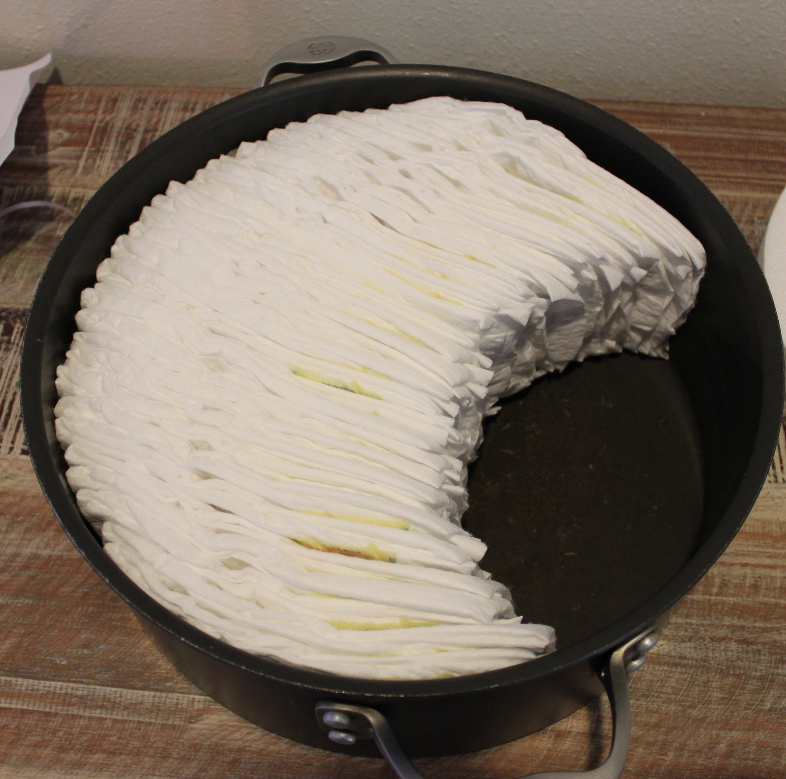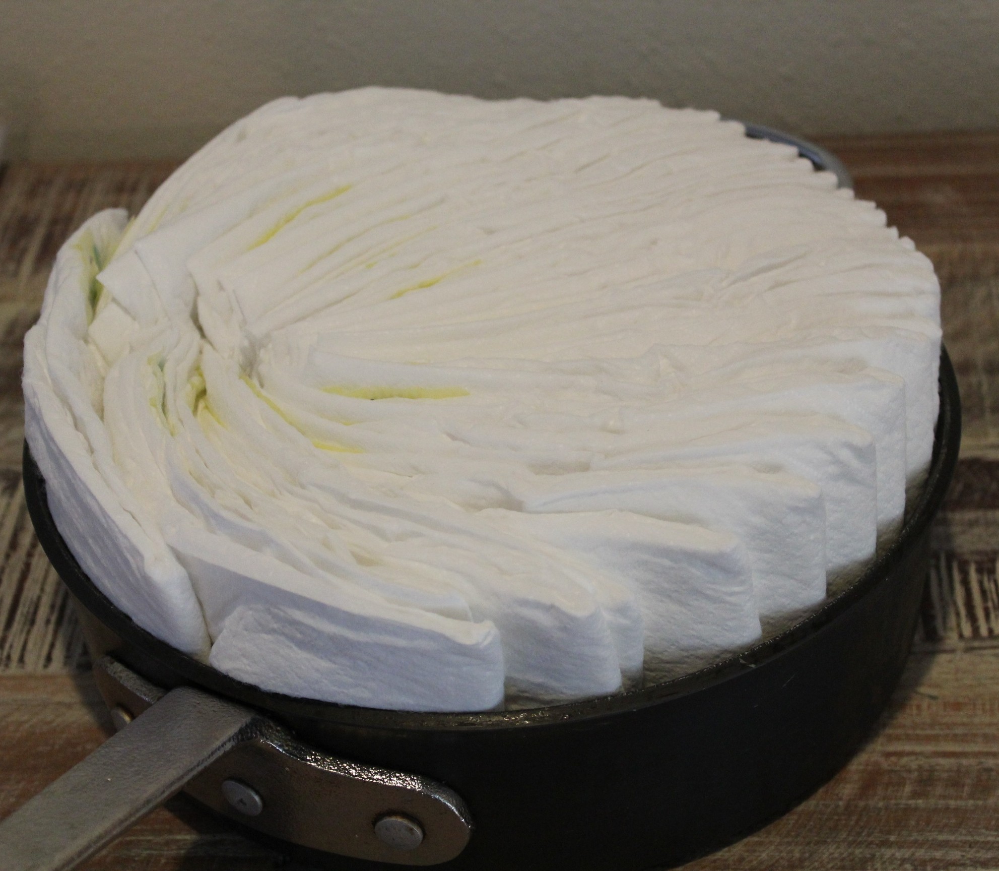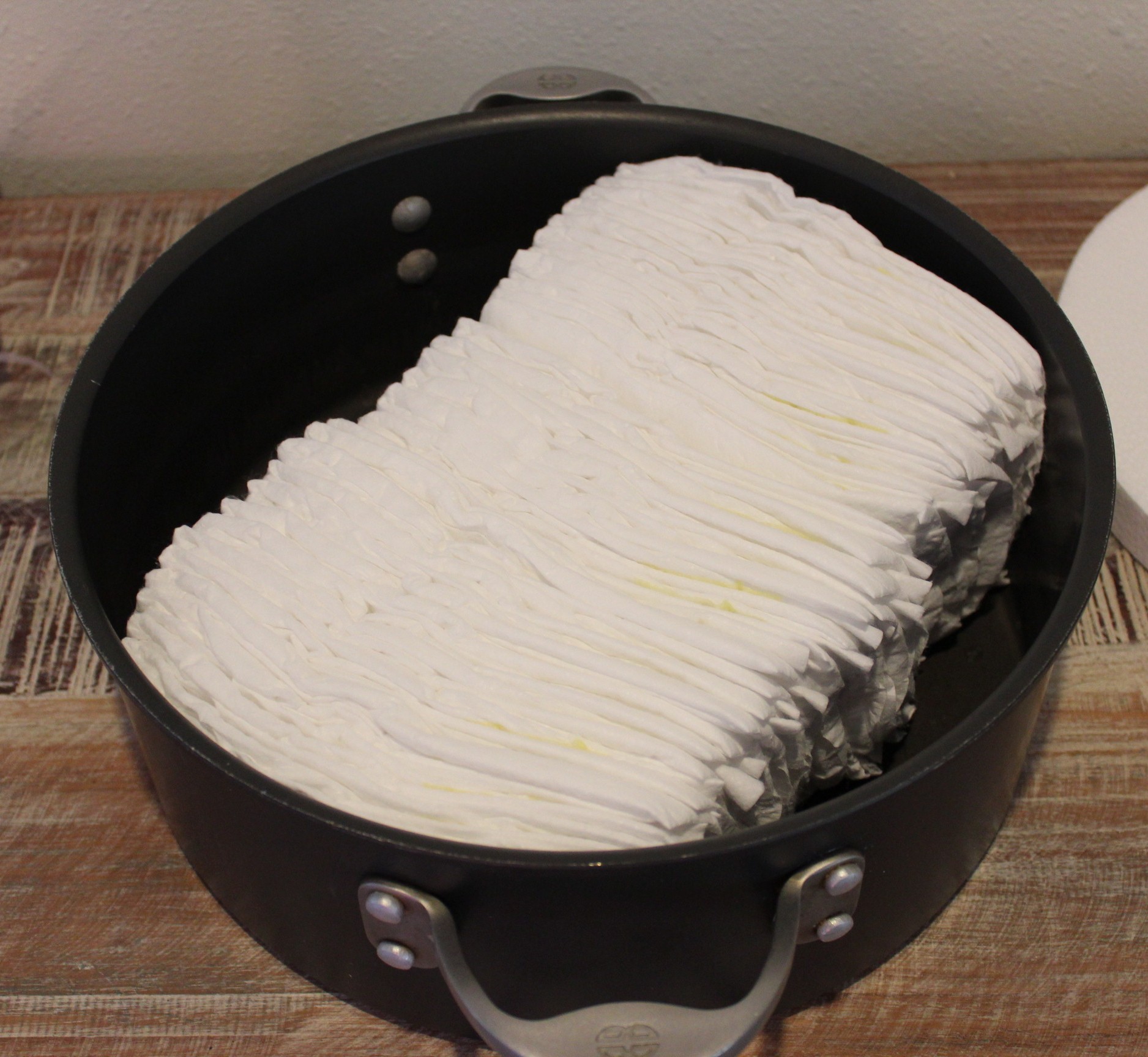 Slide your hand, one at a time, along each new diaper to push it into place. Usually I push with my right hand and gently pull with my left until it is along side the edge of the pan. You’ll want to get them as tight as possible so your layers will hold together. Once you move those all to the edge, add more diapers and keep going. The ends of these diapers will stick out, simply curve them around and they’ll start to fill in the hole that is left.