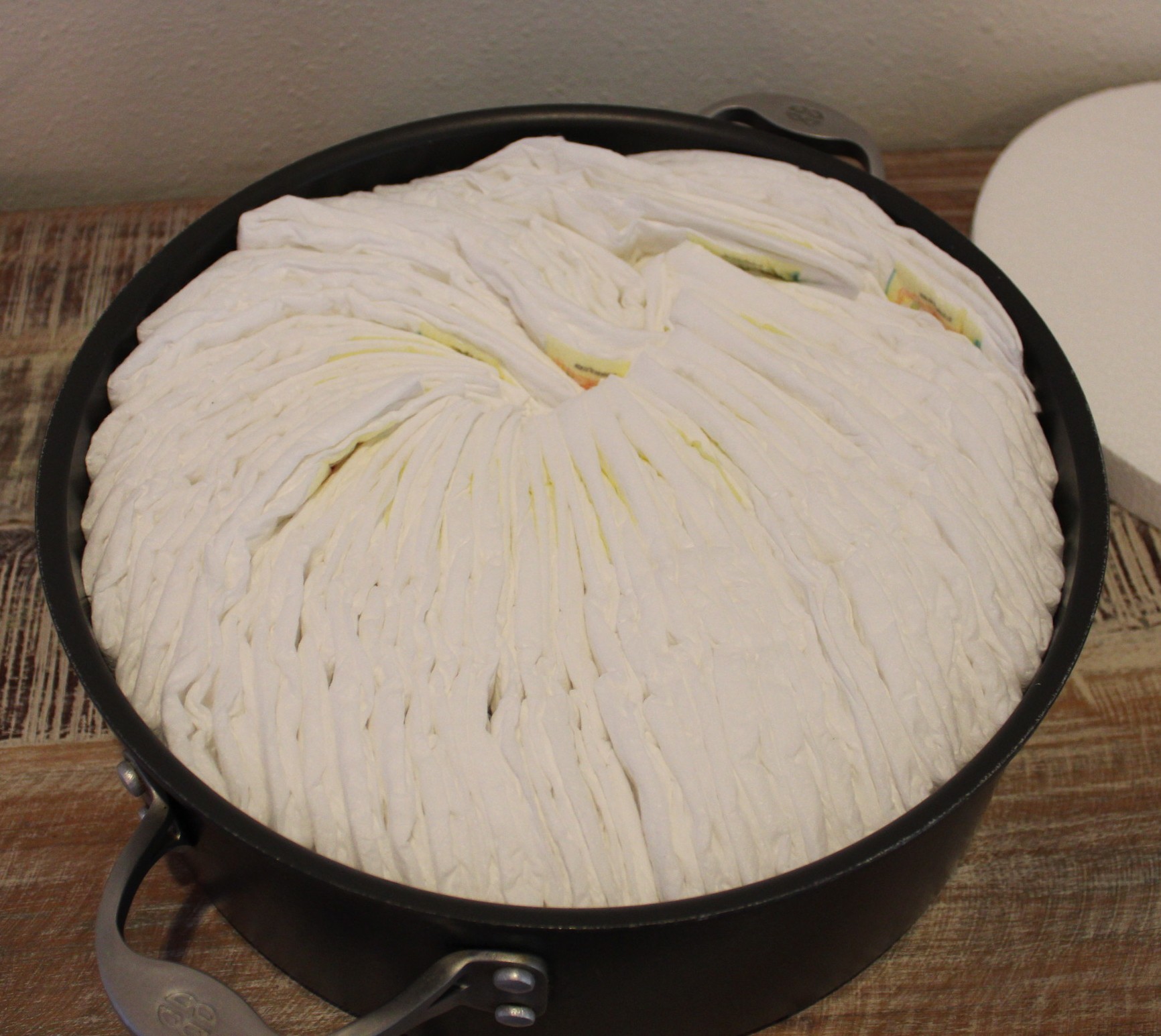Once the gap is filled, squeeze a few extra diapers along the top edge to cover up the little spiral and make your layer look smooth. Don’t worry if it looks a little funky, this will be the back of the layer. The front will be where your original diapers are nice and uniform. If you’re covering with receiving blankets then it really doesn’t matter at all.