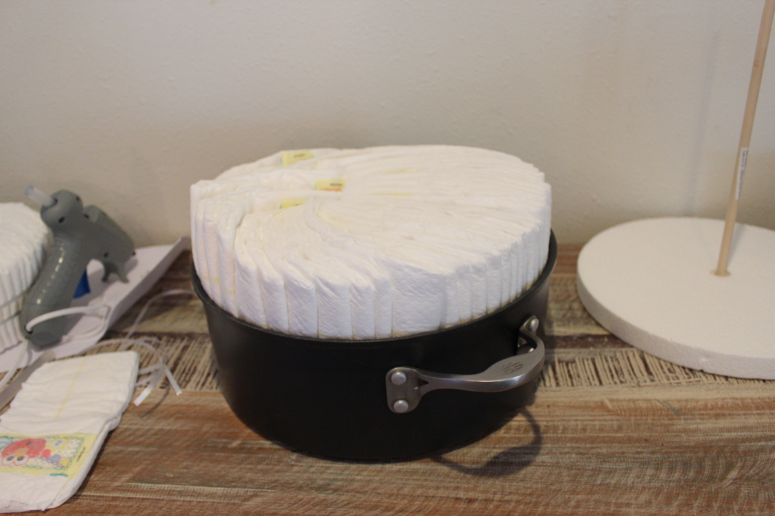 Now do the next size layer the exact same way. This pan is shorter than the diapers so it was way easier to tie the ribbon. Be sure to cut the ends off of the ribbon so it won’t be seen.