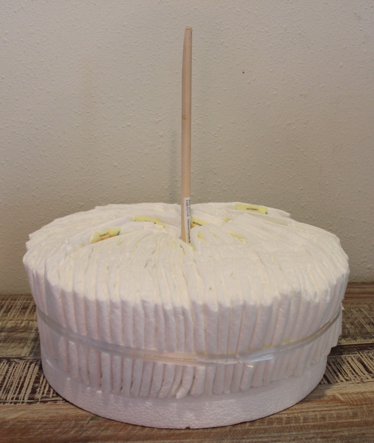 I get a 12″ Styrofoam disk and a small dowel rod at Hobby Lobby to make a base. Measure your dowel rod by laying three diapers along it, and then cut about and inch and a half shorter than that so it doesn’t stick out the top. Use hot glue to stick the disk and the dowel together. You don’t have to worry if it’s dead center, because you’ll be able to slide your layers around where you need them.