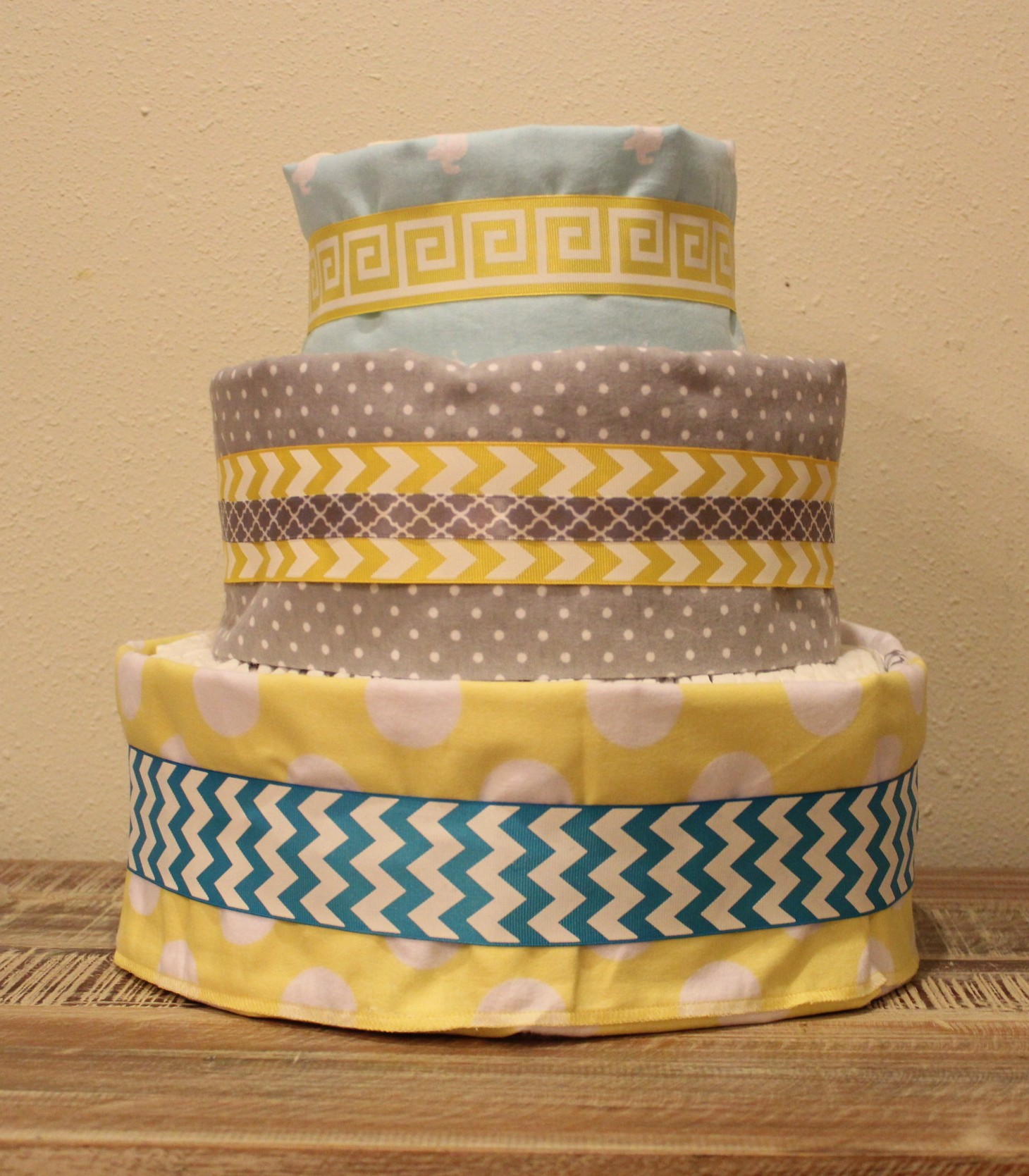 I’ve looked at diaper cakes in the past and decided not to make them because it seemed so time consuming and difficult. All the rolling, rubber banding, and pinning didn’t seem like an ideal way to spend an afternoon. So I was pretty excited when I discovered the no roll method. Not only is it easier, but it’s faster and incorporates way more diapers than roll cakes. These can be as simple or as fancy as you want, and can be made to match any theme or color scheme.